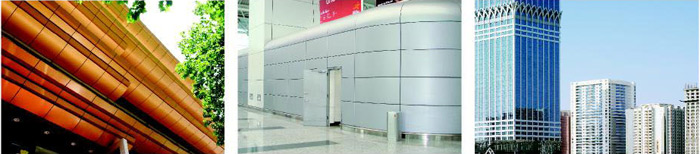 幕墻鋁單板適用于各種建筑內外墻、大堂門面、雨蓬、柱飾、高架走廊、人行天橋、電梯包邊、陽臺、廣告指示牌、室內異形吊頂等的裝飾。